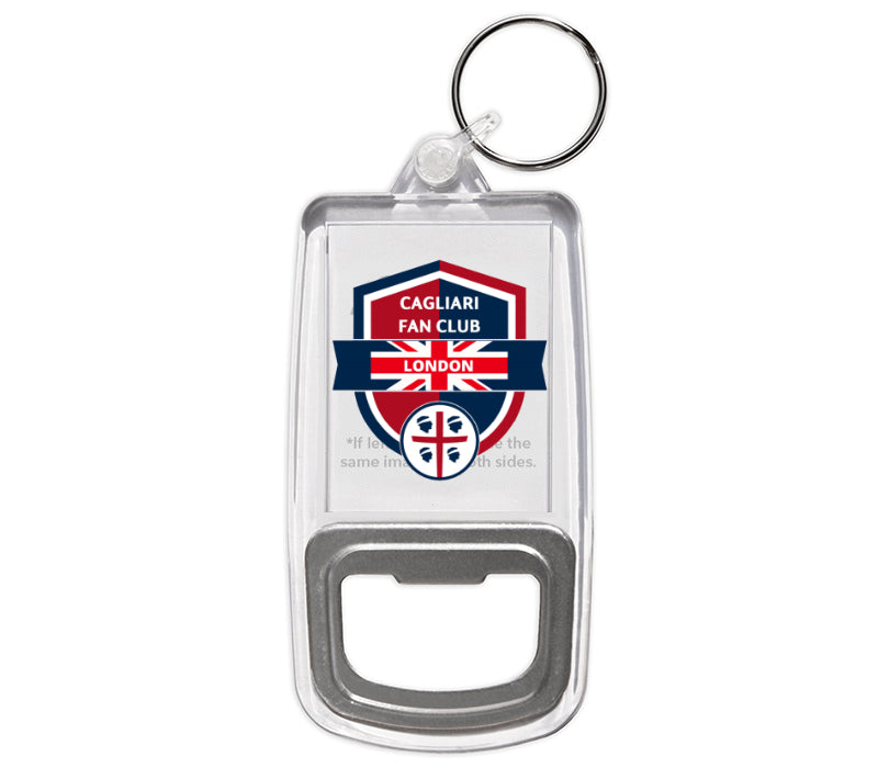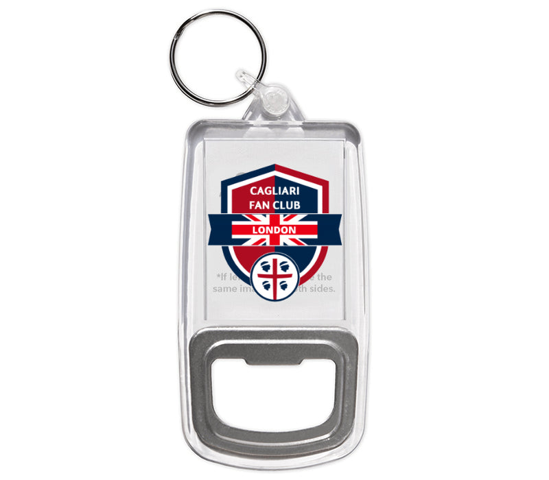 Personalised double sided plastic bottle opener photo keyring with an insert size of 45mm x 35mm. Images are printed onto 280gsm premium glossy photo paper.