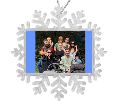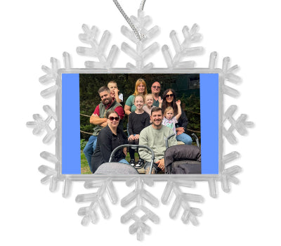 Personalised premium quality double sided Christmas snowflake ornament with an insert size of 70mm x 45mm. Photos are printed onto 280gsm premium glossy photo paper.
