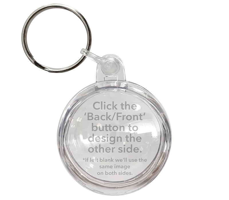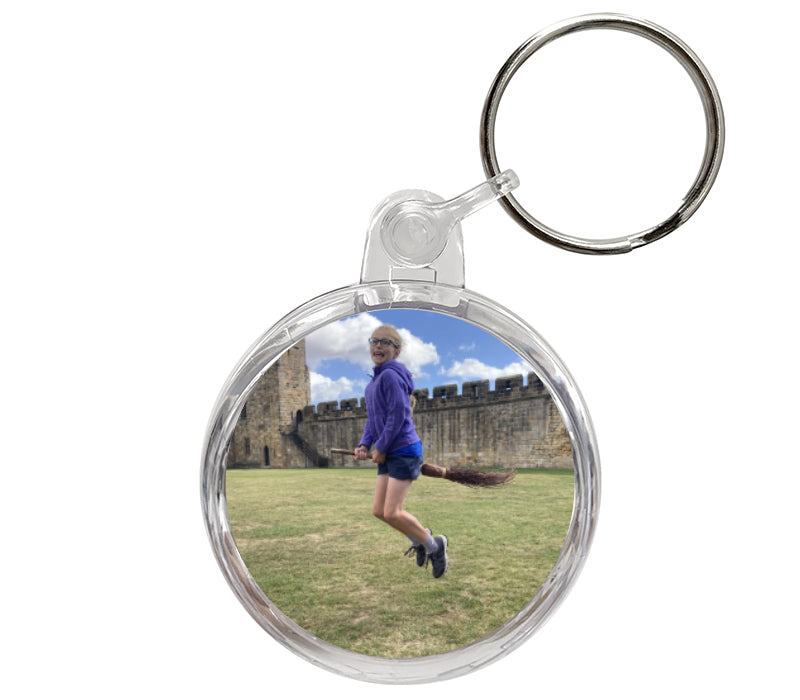 Personalised premium quality double sided clear acrylic photo keyring with a round insert size of 38mm. Images are printed onto 280gsm premium glossy photo paper.