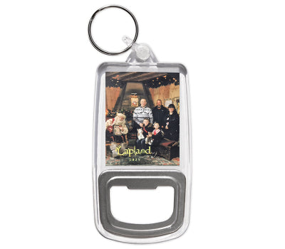 Personalised double sided plastic bottle opener photo keyring with an insert size of 45mm x 35mm. Images are printed onto 280gsm premium glossy photo paper.