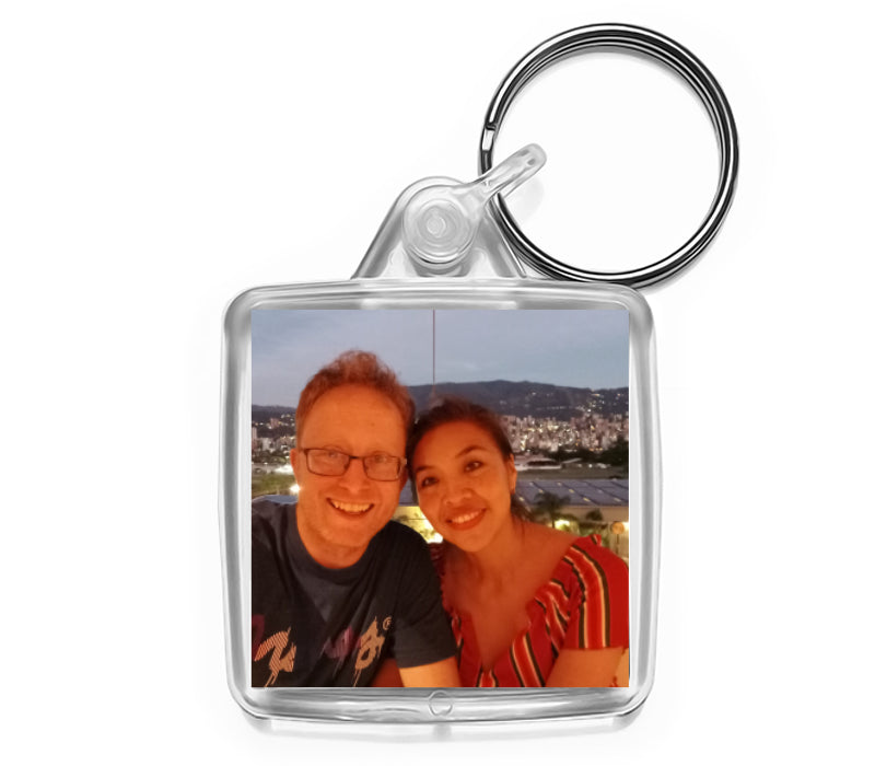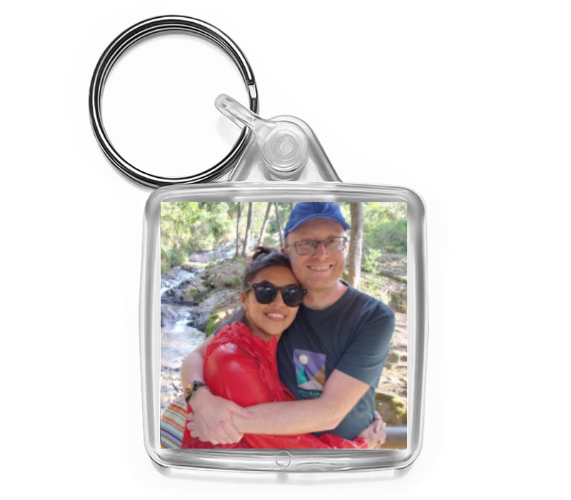 Personalised premium quality double sided clear acrylic photo keyring with a square insert size of 38mm x 38mm. Images are printed onto 280gsm premium glossy photo paper.