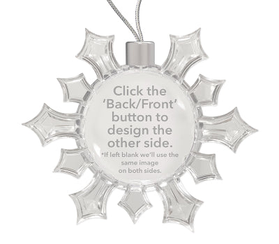 Personalised premium quality double sided Christmas snowflake ornament with an insert size of 53mm x 53mm. Photos are printed onto 280gsm premium glossy photo paper.