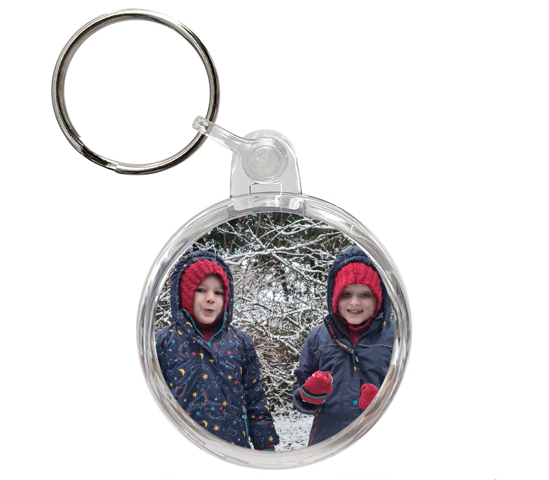 Personalised premium quality double sided clear acrylic photo keyring with a round insert size of 38mm. Images are printed onto 280gsm premium glossy photo paper. Each keyring is individually bagged.