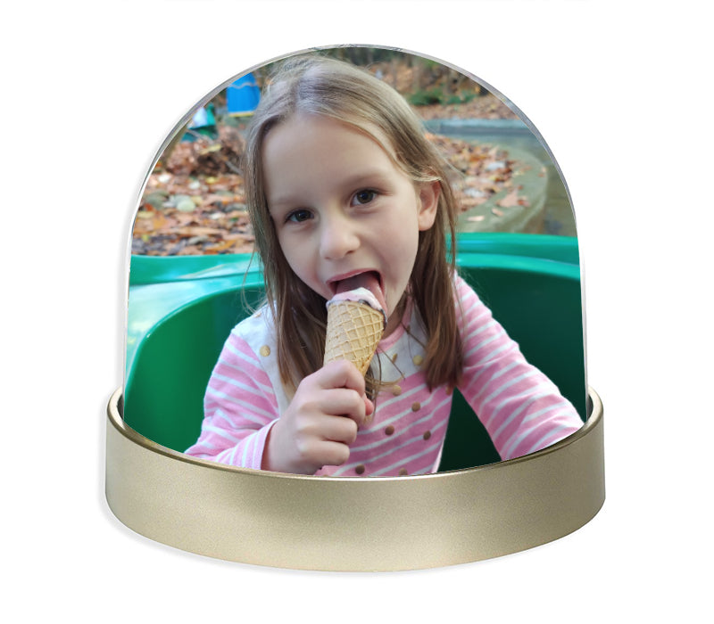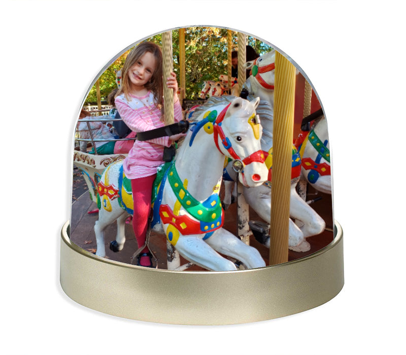 Premium quality personalised double sided round snow dome ormament with an insert size of 70mm x 62mm. The base of the snowdome is plastic with a metallic finish. Images are printed onto 280gsm premium glossy photo paper. Each snowglobe is individually bagged.