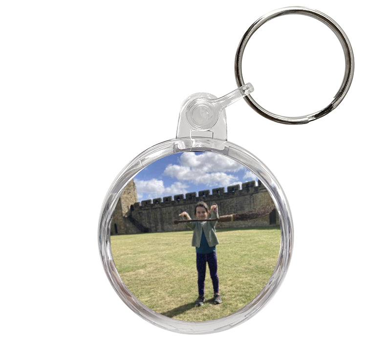 Personalised premium quality double sided clear acrylic photo keyring with a round insert size of 38mm. Images are printed onto 280gsm premium glossy photo paper. Each keyring is individually bagged.